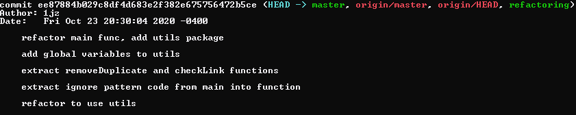 First I created a new branch called refactoring based off master and began refactoring code. I ended up extracting a piece of code which ignored urls and turned it into a function which returns and array rather than modify an existing one. I then took all the functions, structs and global flag variables and put them into a utils (utilities) folder as I took a scripting approach by shoving all the logic into a single file, cause you know.. why not? Anyway, every change I made I would commit them to my local repository and when the refactoring was complete I was ready to squash my commits and push it to github.